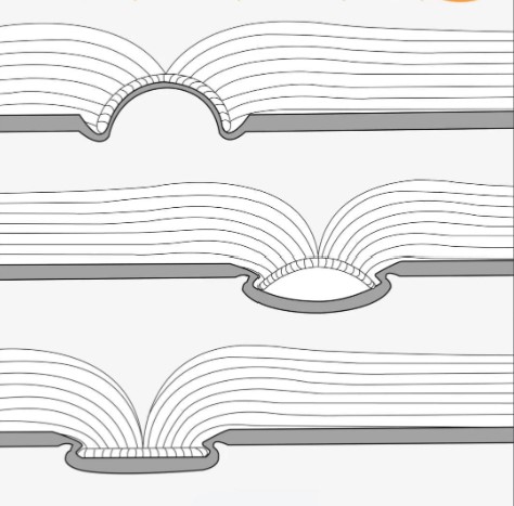 还有腔背装,它的背脊部分设有腔体。这种设计有个小缺点,就是在直立放置时,会发生书页整体下垂的现象。但它也有很大的亮点,同样能实现180度平摊,阅读体验很好,而且外观看起来十分美观。